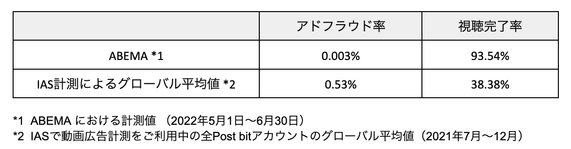 今回のIAS計測の対応に際し「ABEMA」のCTV広告を2ヶ月間テスト計測したところ、IASによる動画広告の世界平均値と比較して、アドフラウド率は約177分の1、広告視聴完了率は約2.4倍高い結果となりました。