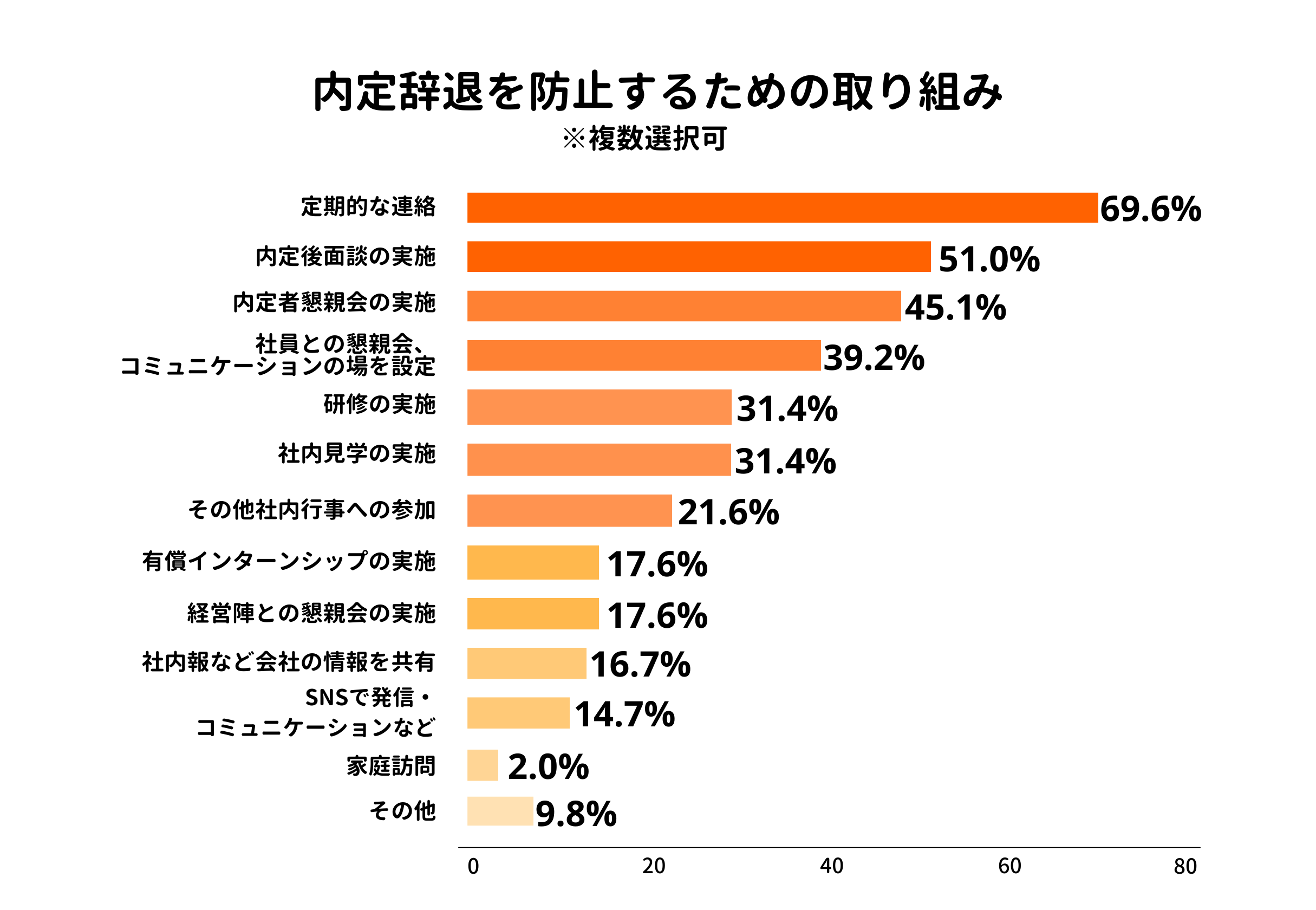 ■内定辞退防止の取り組みは、「定期的な連絡」(69.6%)、「内定後面談の実施」(51.0%)、「内定者懇親会の実施」(45.1%)