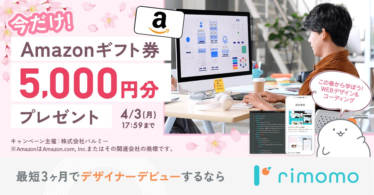 株式会社パルミー(所在地:東京都港区、代表取締役:伊藤貴広、以下パルミー)は、本日2023年3月20日(月)14時00分から、デザインのスキルが学べるオンライン学習サービス「rimomo(リモモ)」の月額プランを契約するとAmazonギフト券が5,000円分もらえるキャンペーンを開催いたします。