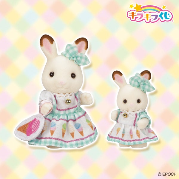 アイスクリーム柄のおそろいのワンピースを着た、ショコラウサギの女の子と赤ちゃんのセットです。