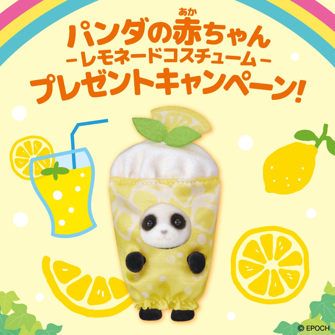 さらに、キラキラくじの半券を、全国の対象おもちゃ販売店にお持ちいただいてお買い物をされた方を対象に、オリジナルコスチュームのパンダの赤ちゃん –レモネードコスチューム- をプレゼントするキャンペーンも実施いたします。
