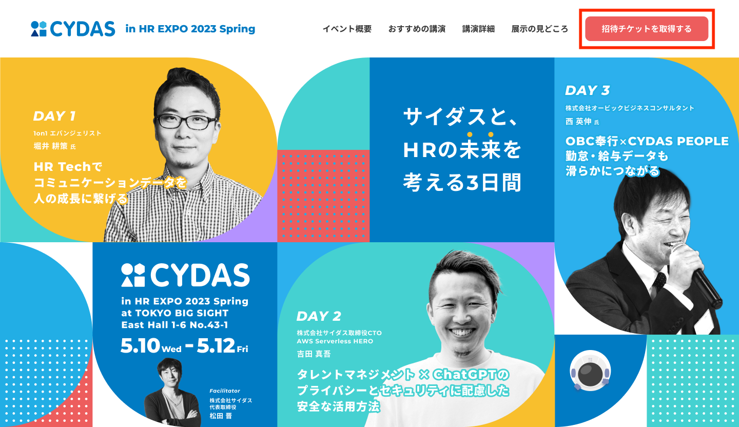 ① 特設サイトTOP( https://www.cydas.com/hr_expo2023/ )の、「招待チケットを取得する」をクリックし、情報登録