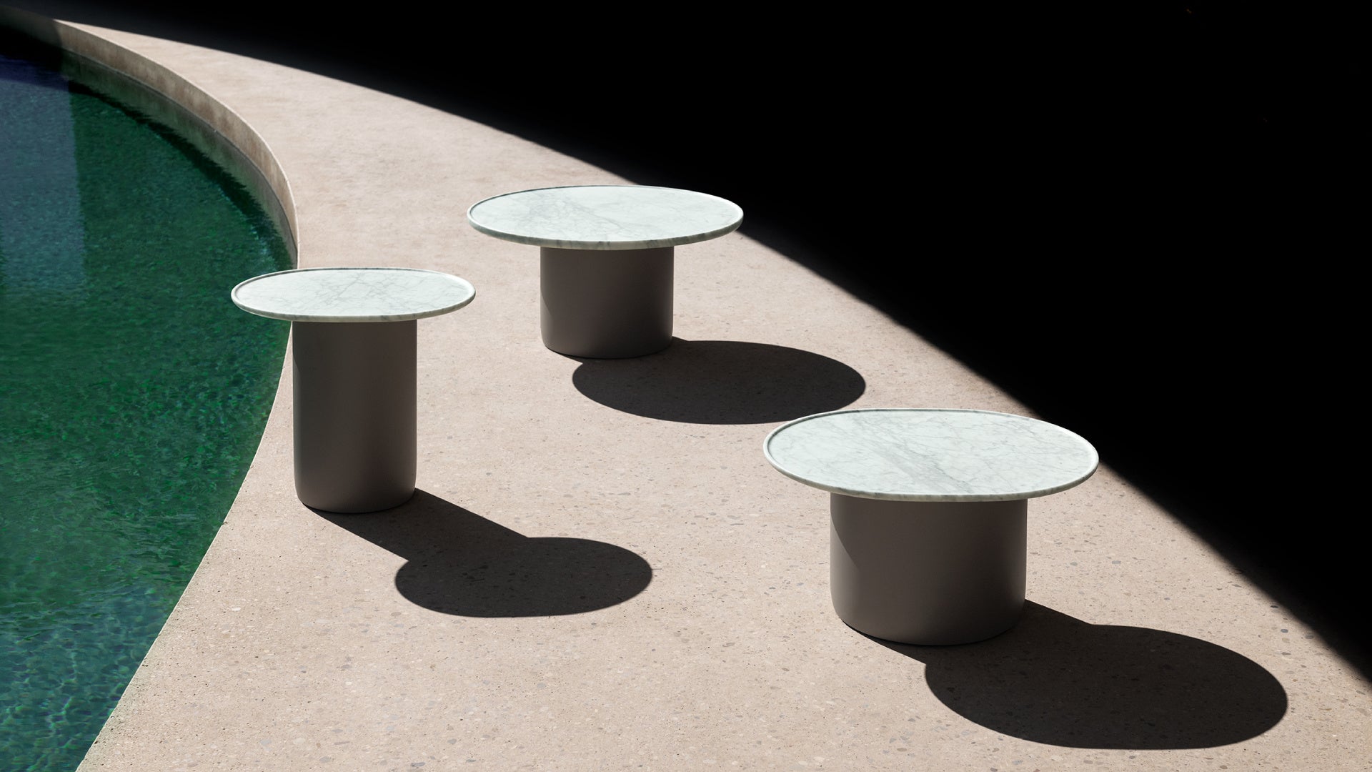 インドア仕様の発表から10年を経て登場した<Button Tables Outdoor (ボタン テーブル アウトドア)>。異素材の組み合わせや、曲線的なデザインと硬質なマテリアルが生むコントラストといったデザインコンセプトは、アウトドア仕様でも変わらず反映されています。