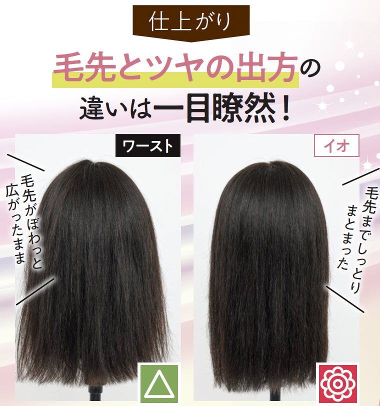みずみずしいうるおい感、毛先までスルッとまとまる手応えは感動もの。オイルをつけたようなツヤも宿り、仕上がりのよさで他を圧倒したイオ。キューティクルを整えてツヤを与えるラノリン脂肪酸を配合するなど、成分面も高評価で見事ベストに輝きました。