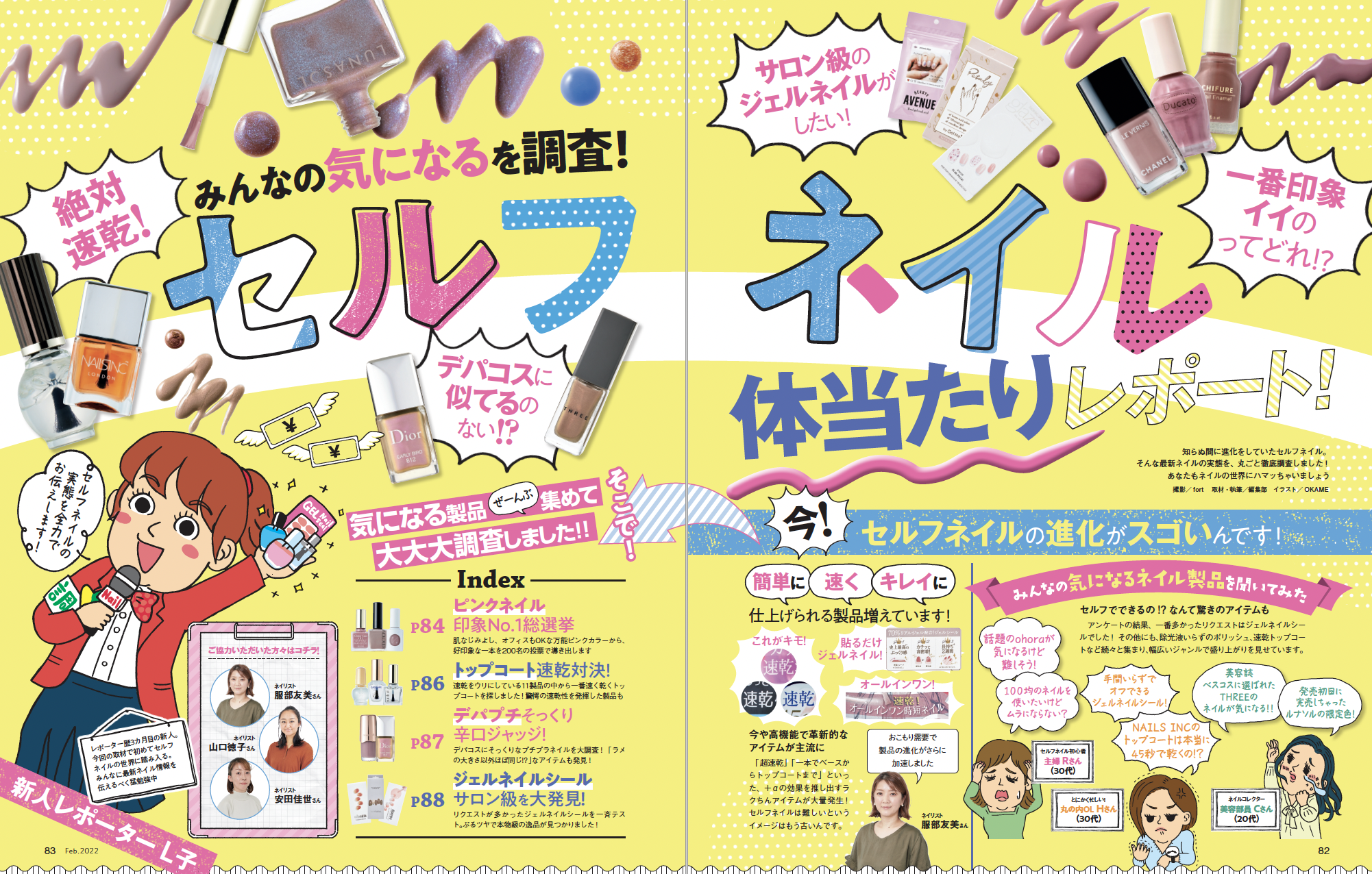 知らぬ間に進化をしていたセルフネイル。 肌なじみのいい「ピンクネイル印象No.1総選挙」、速乾がウリの「トップコート速乾対決!」、アンケートでリクエストが一番多かった「ジェルネイルシール サロン級を大発見!」など、最新ネイルの実態を、丸ごと徹底調査しました!