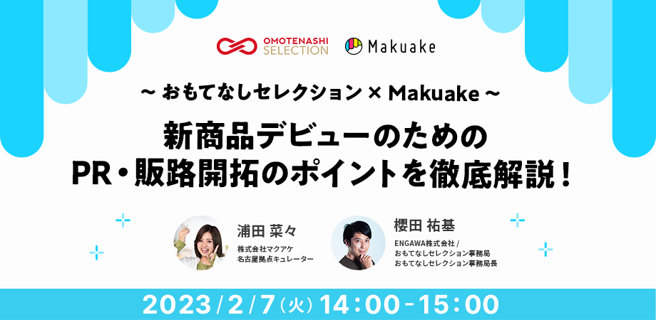 2月1日(水)よりアタラシイものや体験の応援購入サービス「Makuake(マクアケ)」の特設ページでお披露目および販売を行います。本プロジェクトに関する特別セミナー「〜おもてなしセレクション×Makuake〜 新商品デビューのためのPR・販路開拓のポイントを徹底解説!」を2023年2月7日(火)にオンラインにて開催します。