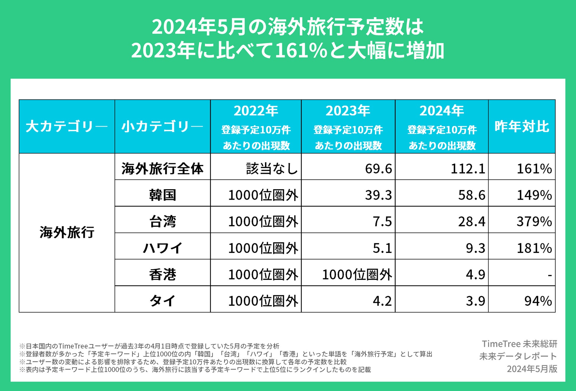 続いて「休暇予定」と関連性の高い「旅行」の予定を分析したところ、「海外の地名」「海外の地名+旅行」などのキーワードで登録された「海外旅行」の予定数は2023年に比べて161%と大幅に増加する結果に。