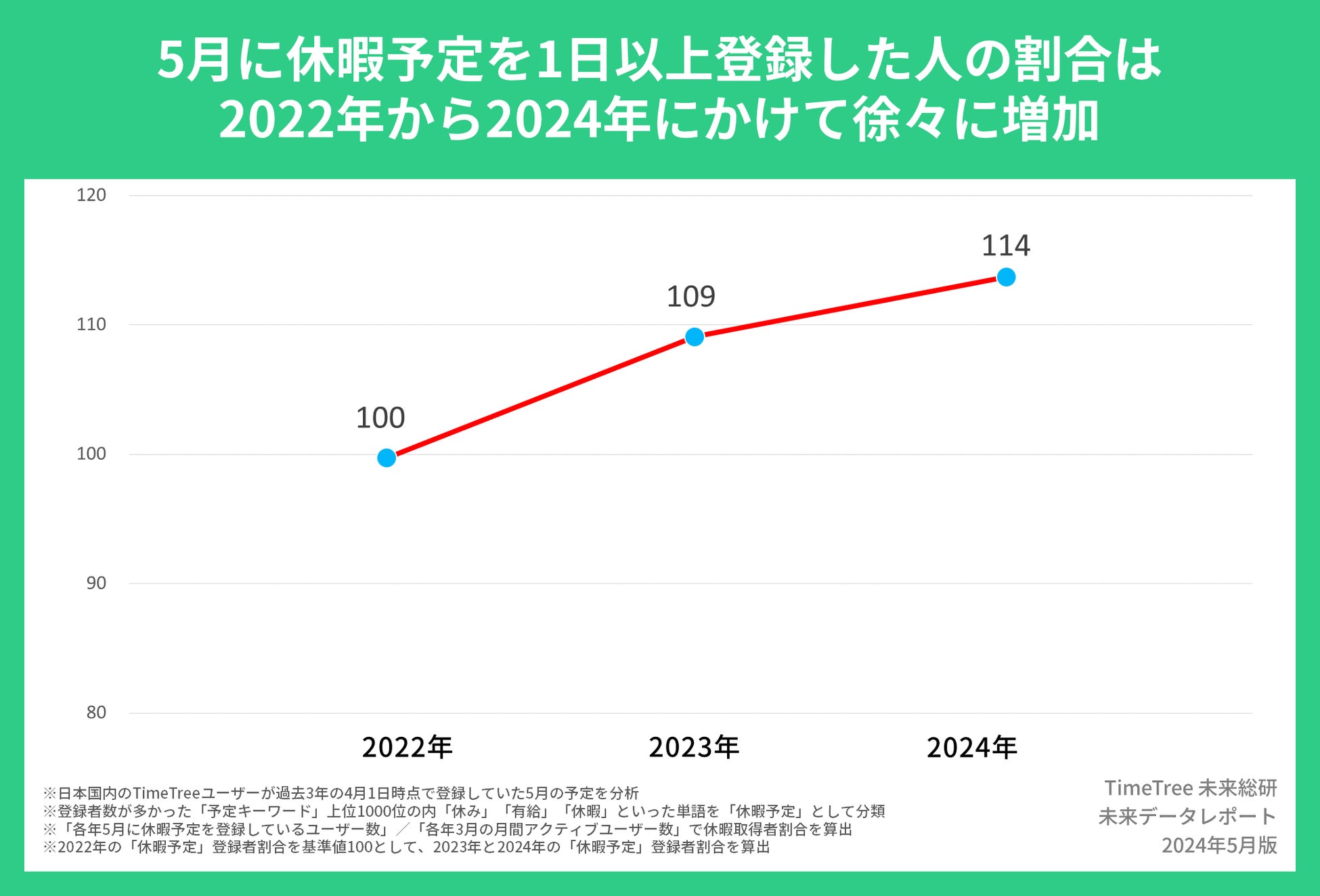 2022年5月の「休暇予定」登録者の割合を100として、2023年と2024年の「休暇予定」登録者の割合を算出すると、直近3年の「休暇予定」登録者の割合は増加傾向にあることが見てとれました。