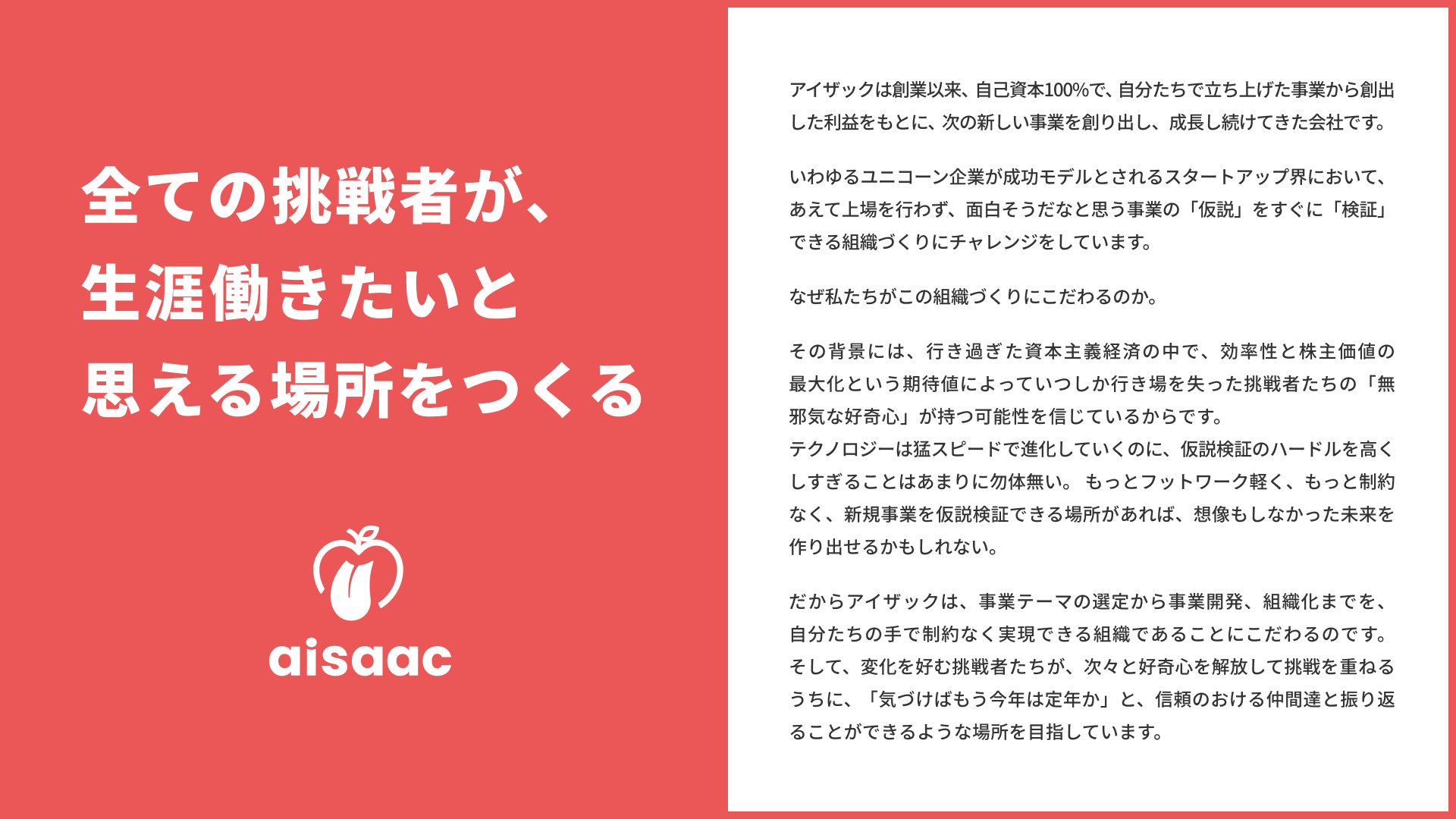 設立9年目を迎えたアイザックは「100%自己資本経営を保ったまま、営業利益100億を目指す」という目標達成に向けて事業拡大し、採用を強化しています。2024年1月には、アイザックの存在意義として、「全ての挑戦者が生涯働きたいと思える場所をつくる」というメッセージを発表しました。