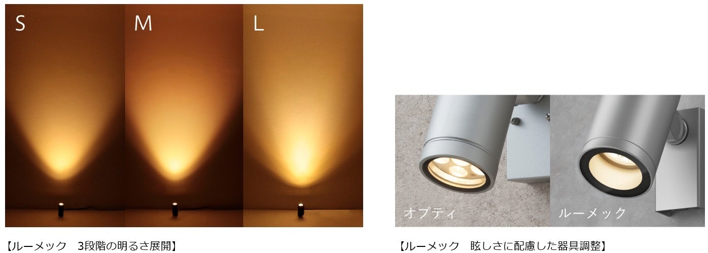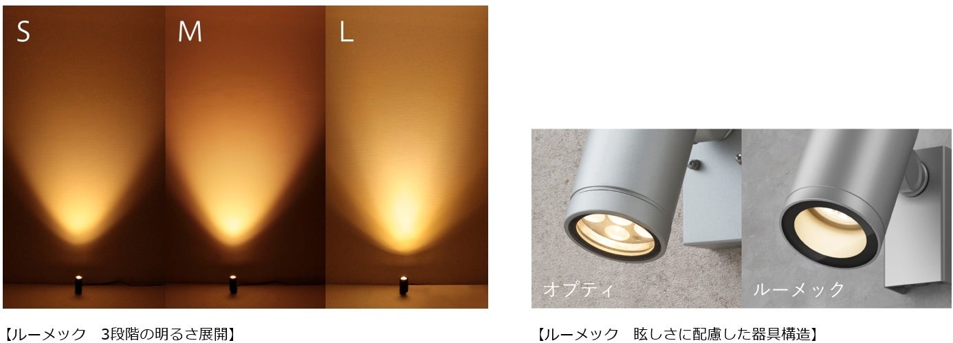 S/M/Lの3段階で選べる明るさ展開とし、SとMにはルーメックと共通のLEDモジュールを採用しています。そして壁面のライトアップ時におすすめの「グレアカット」タイプを新たにラインアップ。壁面にはしっかりと明るさを届けつつ、反対側に照射される光はカットされるため、眩しさが抑えられます。また、SとMはどちらも耐荷重1.5t仕様となっています。
