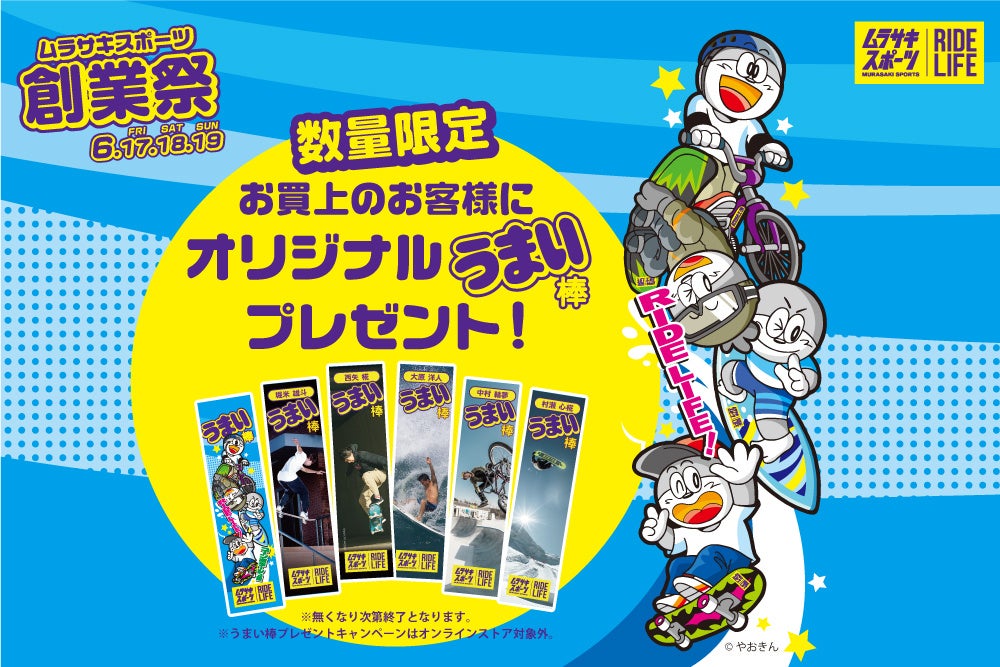 週末はムラサキスポーツへGO!!ムラサキスポーツ創業祭!堀米雄斗や西矢椛、そして「うまえもん」が跳ぶ!オリジナルパッケージのうまい棒プレゼント!