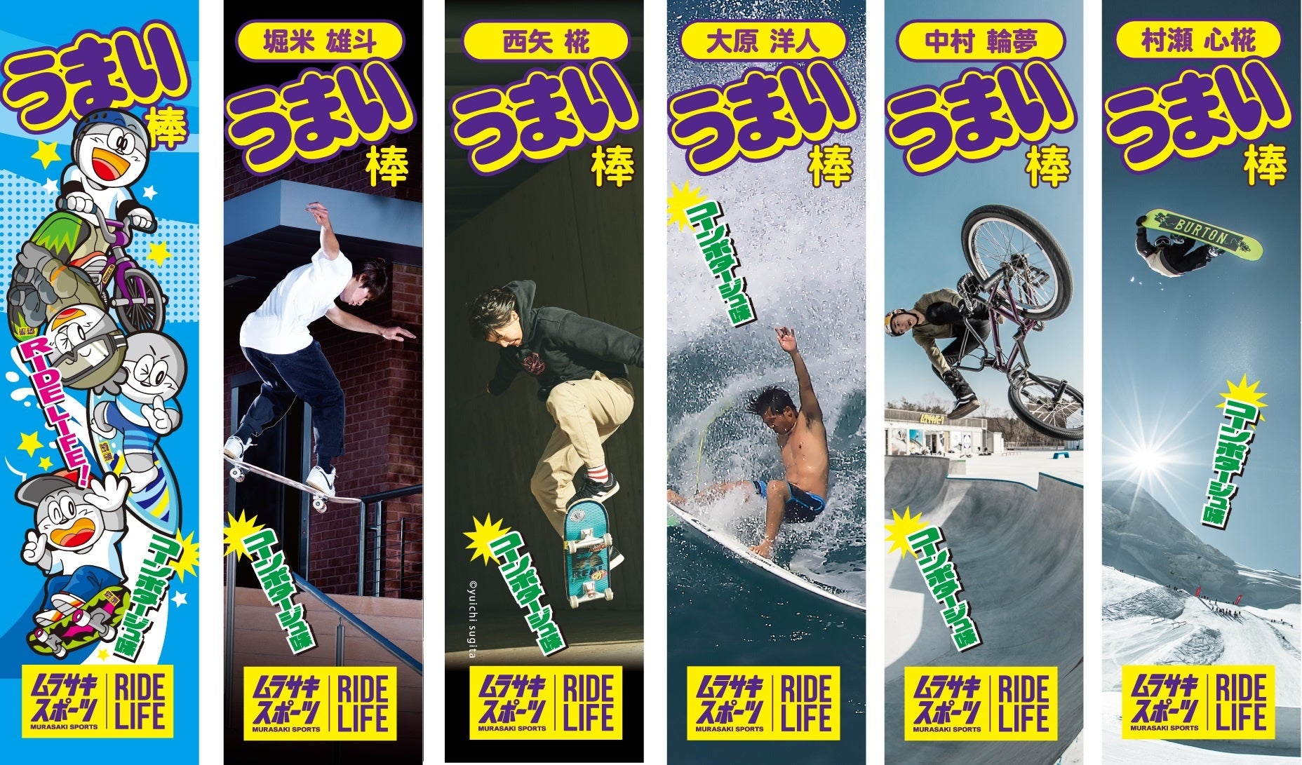 パッケージは全部で6種。ムラサキスポーツが誇る5名のトップアスリート、東京五輪で見事に金メダルを勝ち取った堀米雄斗(スケートボード)、西矢椛(スケートボード)をはじめ、大原洋人(サーフィン)、中村輪夢(BMX)、村瀬心椛(スノーボード)の姿がプリントされたアスリートバージョン5種と、うまい棒のキャラクター「うまえもん」がアクションスポーツにチャレンジしている姿が描かれたオリジナルイラストバージョン1種となります。