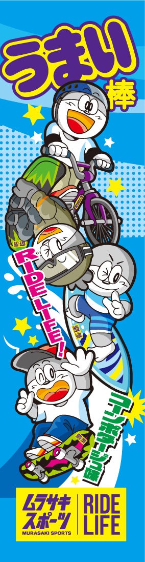 いずれも今年のムラサキスポーツ創業祭でしか手に入らないレアアイテムですが、オリジナルイラストバージョンについてはさらに貴重!多くのコラボレーションを行っているうまい棒においても、うまえもんのイラストの書き下ろしは珍しく、アクションスポーツを楽しむ躍動感あふれる「うまえもん」は超レアアイテムです。