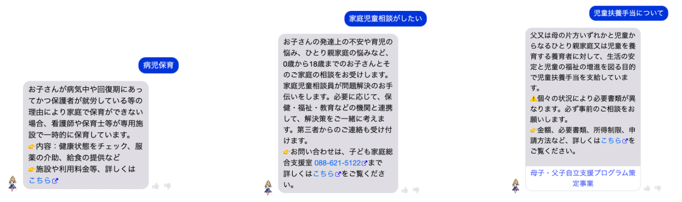 また、子育てガイドブック「さんぽ」の中から特に問い合わせの多い制度のご紹介、徳島市の独自事業もわかりやすく回答できる仕様となっています。