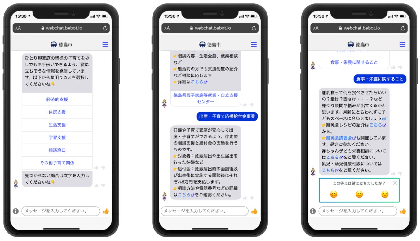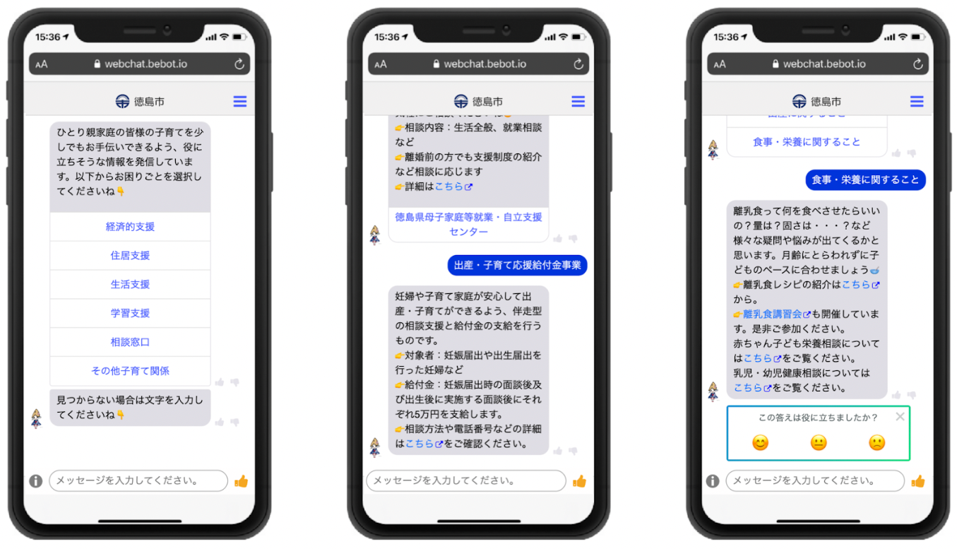 Bebotは、ビースポークが自社開発した自然言語処理エンジンを使ったAIチャットボットです。長い文章でもしっかりと文脈を区切り、単語を抜き出すことができます。意味を理解した上で適切に回答できるため、正しいやり取りを自然な会話として行うことができるのが特長です。徳島市のお問い合わせサービスにBebotが導入されることで、ひとり親家庭が抱える様々な悩みや質問に対し、徳島市のひとり親家庭サポート制度の内容、子育てに関する行政手続き、育児相談など、幅広い情報の中から必要な情報を深夜、休日を問わず、24時間365日、対話形式で案内することが可能となります。