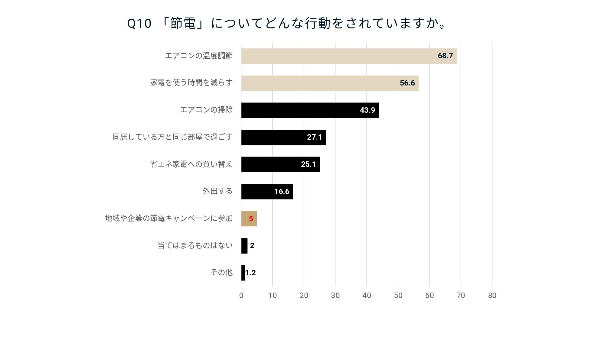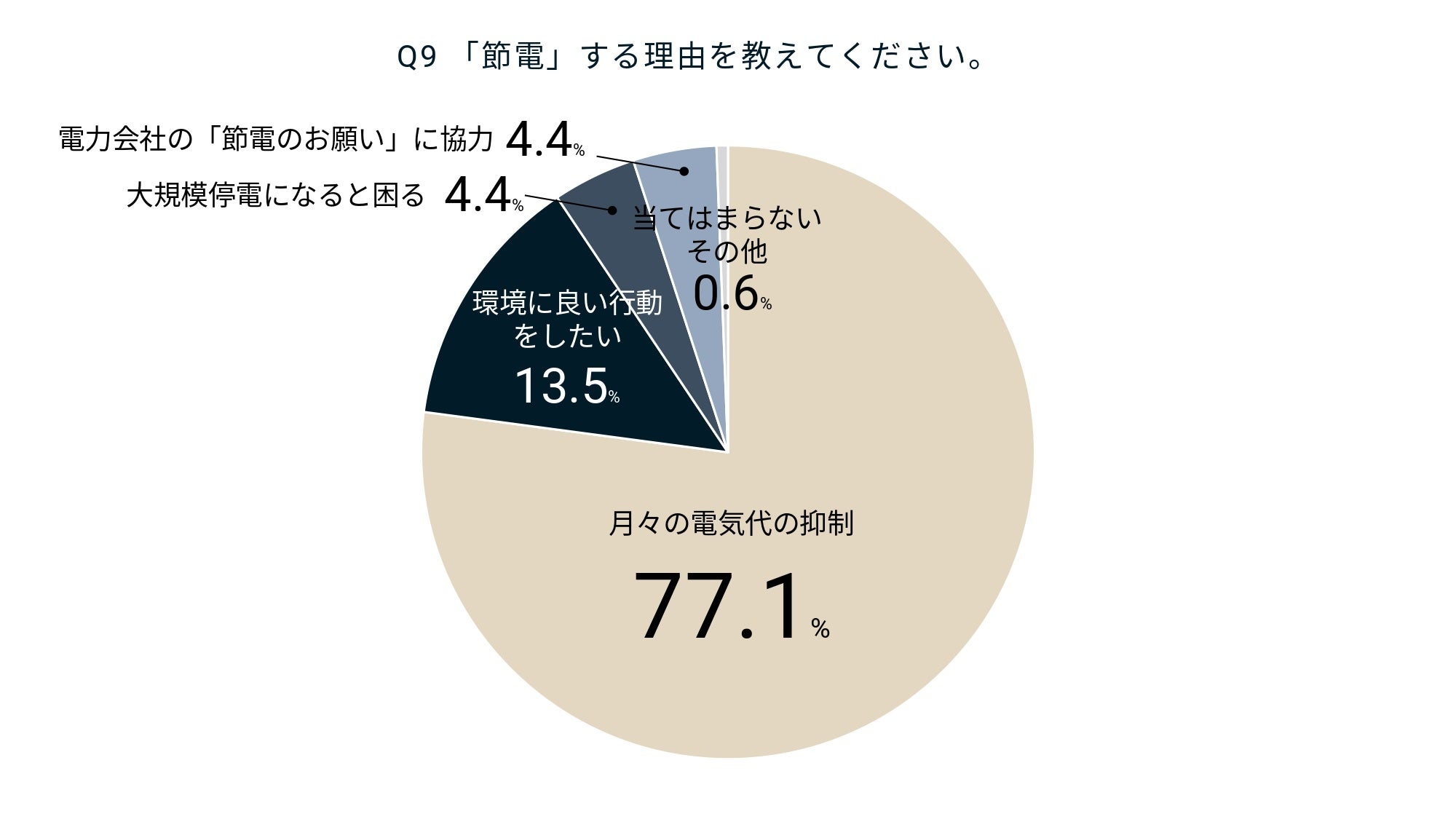 「節電」は<日頃から取り組んでいる>、<気がついた時に取り組んでいる>と全体の79%の人が行っていることがわかりましたが、<電力会社からの”節電のお願い”へ協力>での節電は4%に留まっています。節電理由は<月々の電気代の抑制>が77.1%となりました。節電と認識している行動は<エアコンの温度調節(68.7%)>と<家電を使う時間を減らす(56.6%)>が上位2つとなり、<エアコンを使わない>という記述もありました。
