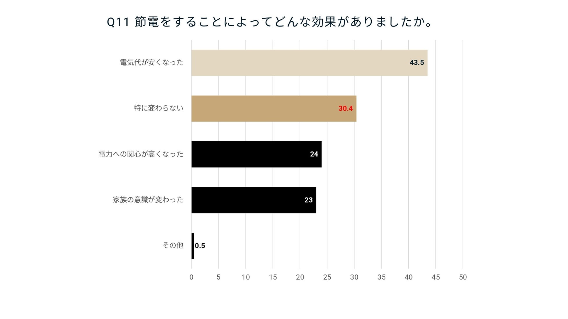 また、節電に取り組んでいる人の中から、節電効果の実感として<電気代の抑制>と回答したのは半数以下の43.5%で、次いで<特に変わらない>と効果を実感していない人も30.4%存在しており、電気代の抑制のために節電をしているにも関わらず、実際に実感できているという回答は半数以下になりました。意識的な変化として<家族の意識が変わった>、<電力への関心が高くなった>は合わせて47%の回答となりました。