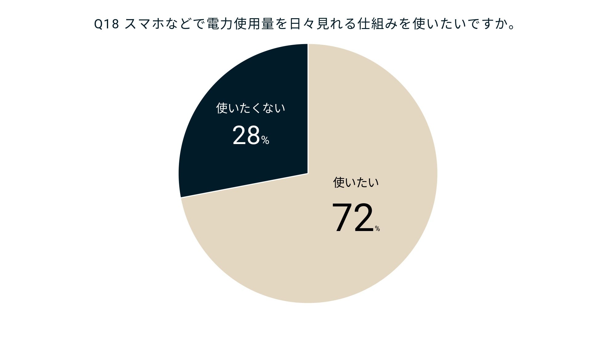 電力は、常に発電 (供給)と消費(需要)の量を一致させることが必須で、予め余分な発電をしておくことはできません。そのため電力を効率的に使用するには、時間帯を選び、実際の使用量をこまめに把握することが大切です。本調査でも<スマートフォンで電気使用量を日々チェックできる仕組みを利用したい>という回答は72%となり、今後電力使用量の可視化は生活において必要な数値としてニーズが高まっているといえます。また、各家庭や個人が電力使用量が増加する時間帯などを把握し、電力をマネジメント(エネルギーマネジメント)することで、電力需要のピークシフトやピークカットが起こり、発電量の調整がしやすい火力発電量を減らすことができ、発電の脱炭素化にも繋がります。