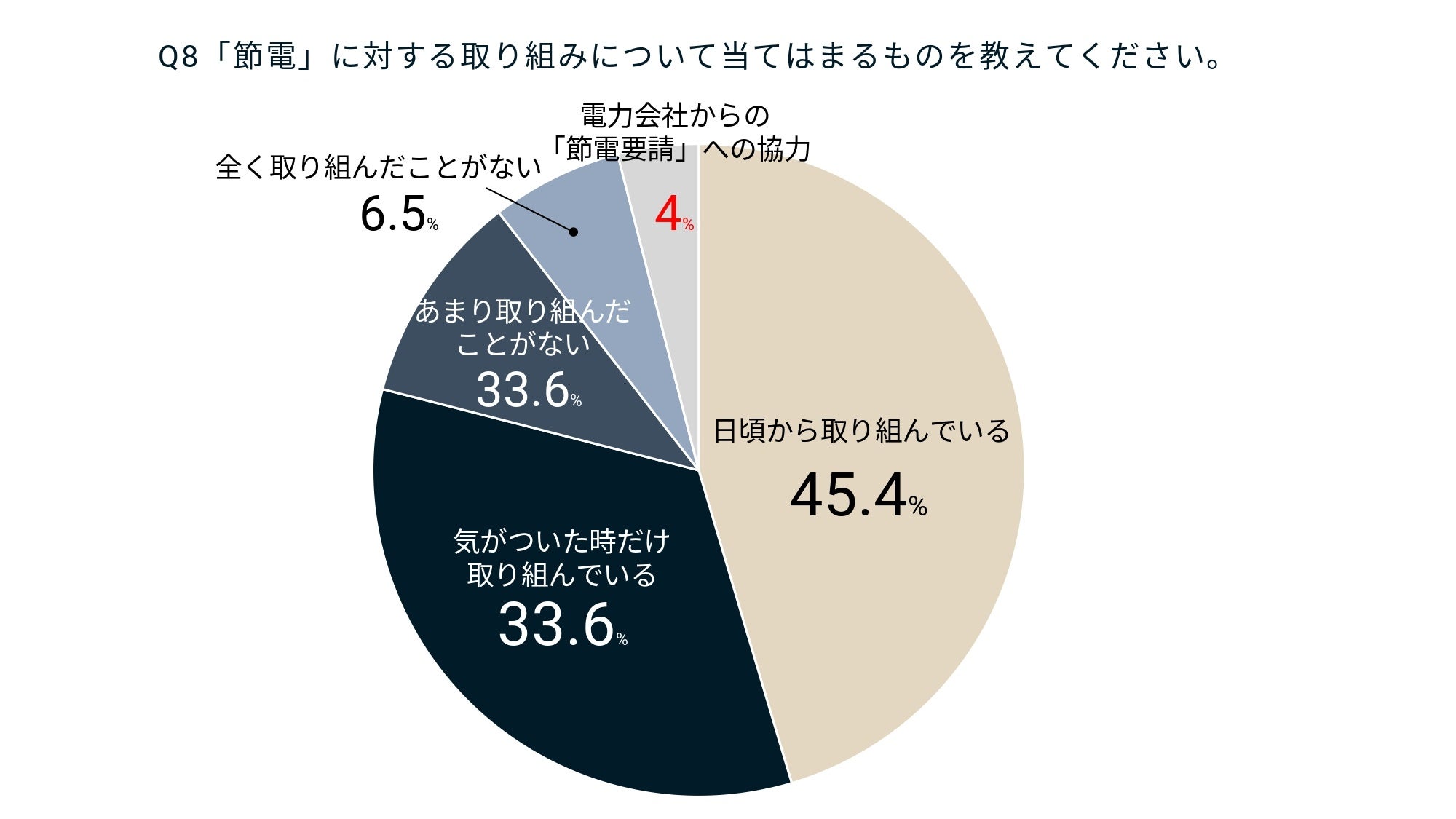 電力事業者が取り組んでいる「デマンドレスポンス(電力の需要側をコントロールし、需要と供給のバランスを調整する取り組み)」の認知度はとても低く、電力会社の呼びかけにより節電に取り組んでいると回答した人も4%と僅かだったことから、電力ひっ迫の理由や抑制方法を理解した上で電力を効率的に使用できている人はとても少数であることがわかりました。