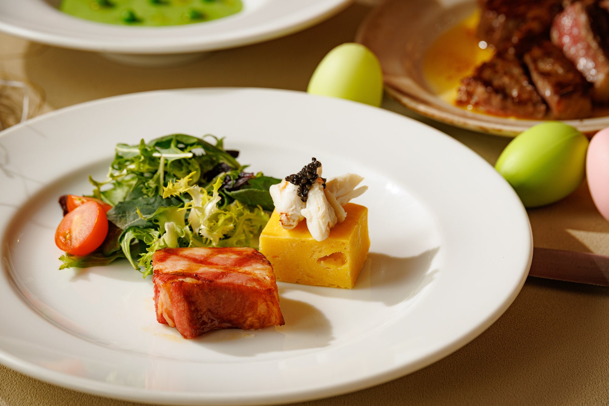 前菜には、イースターの象徴である卵の豊かな風味を生かしたケークサレや、大人のイースターエッグを思わせるクラブミートとキャビアなど、見た目も風味も華やかな「イースターオリジナル前菜盛り合わせ」が登場。メインには、USDA認定のプライムビーフを使用し、ウェットエイジングでしっとりした柔らかさときめ細やかな肉質、上品な甘味と滑らかな口溶けが特長の「フィレミニョン」、または、28日間のドライエイジングによって凝縮された旨味と骨付きならではの香ばしさの「Tボーンステーキ」を、それぞれ異なる魅力を持つ二つのステーキからお選びいただけます。そしてデザートには、イースターバニーの好物として知られるニンジンをすりおろし、自然な甘みとスパイスの温かみを生かし、しっとりと焼き上げたイースターの定番スイーツである「キャロットケーキ」などをご用意し、春の訪れを感じさせるコースに仕上げました。