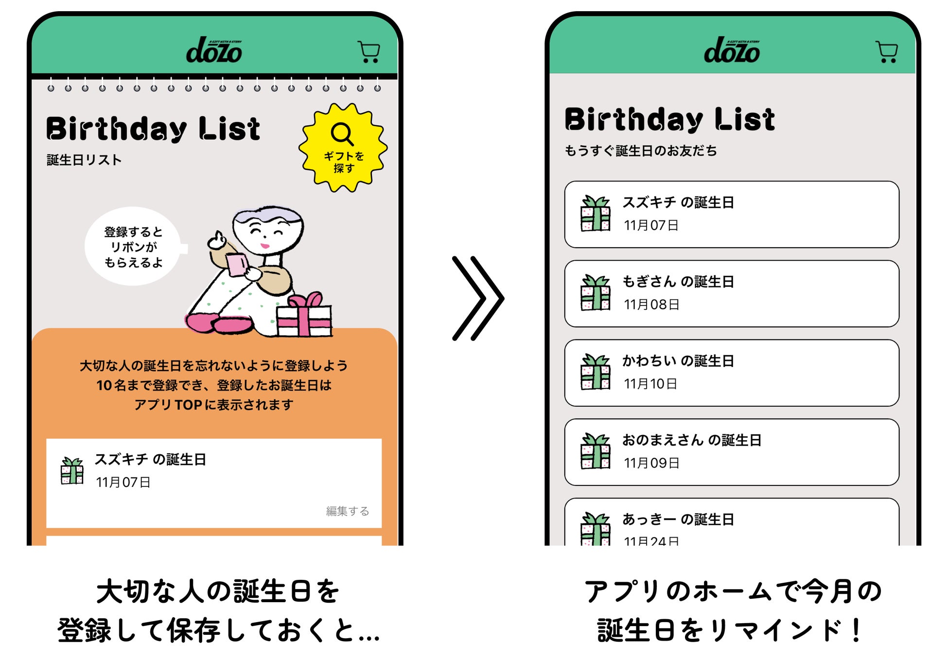 dōzoオリジナルグッズ等がもらえるポイントプログラム制度や、忘れたくない大切な人の誕生日を一括管理する「誕生日リスト機能」など、アプリ限定の豊富な機能が満載!