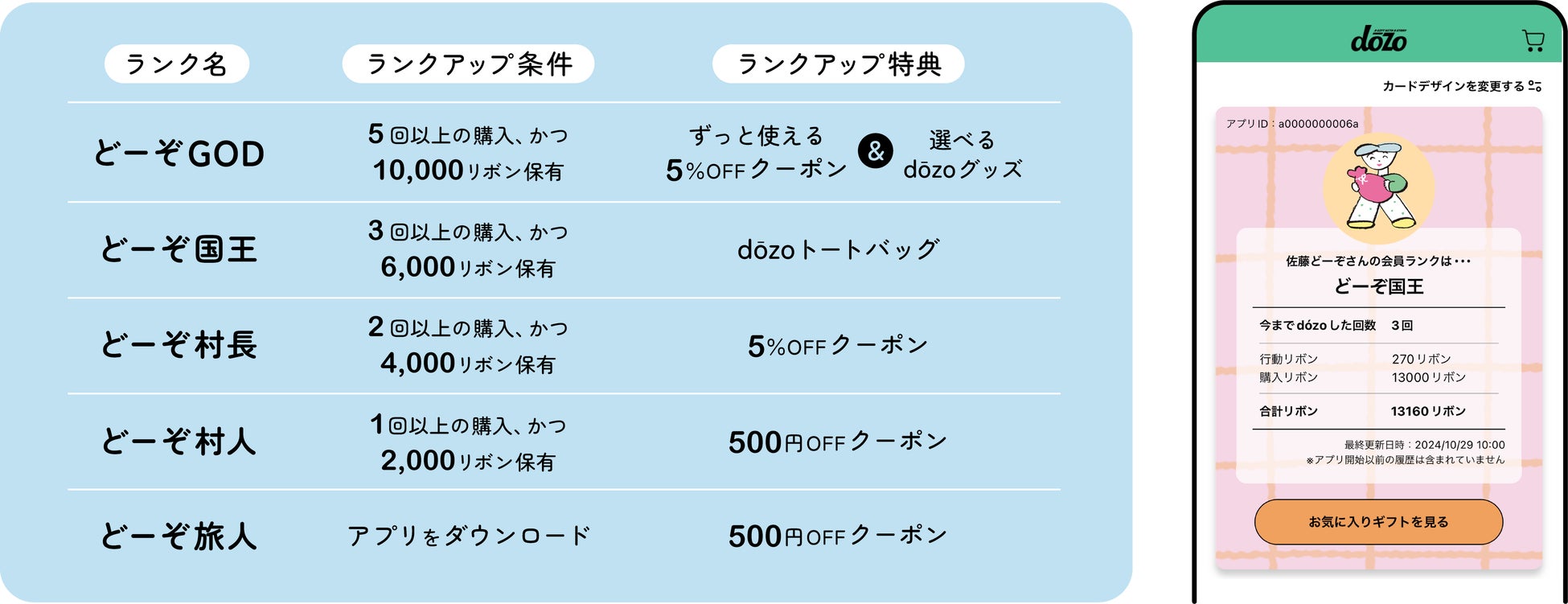dōzoアプリのポイントプログラムは、dōzoの購入はもちろん、「毎日占い」や「誕生日リスト」でdōzoアプリを楽しんでいただくことでもポイント(アプリ内名称では「リボン」)がたまる仕組み。リボンの数や購入回数に応じてランクアップし、お得なクーポンやここでしか手に入らないdōzoオリジナルグッズがもらえます。