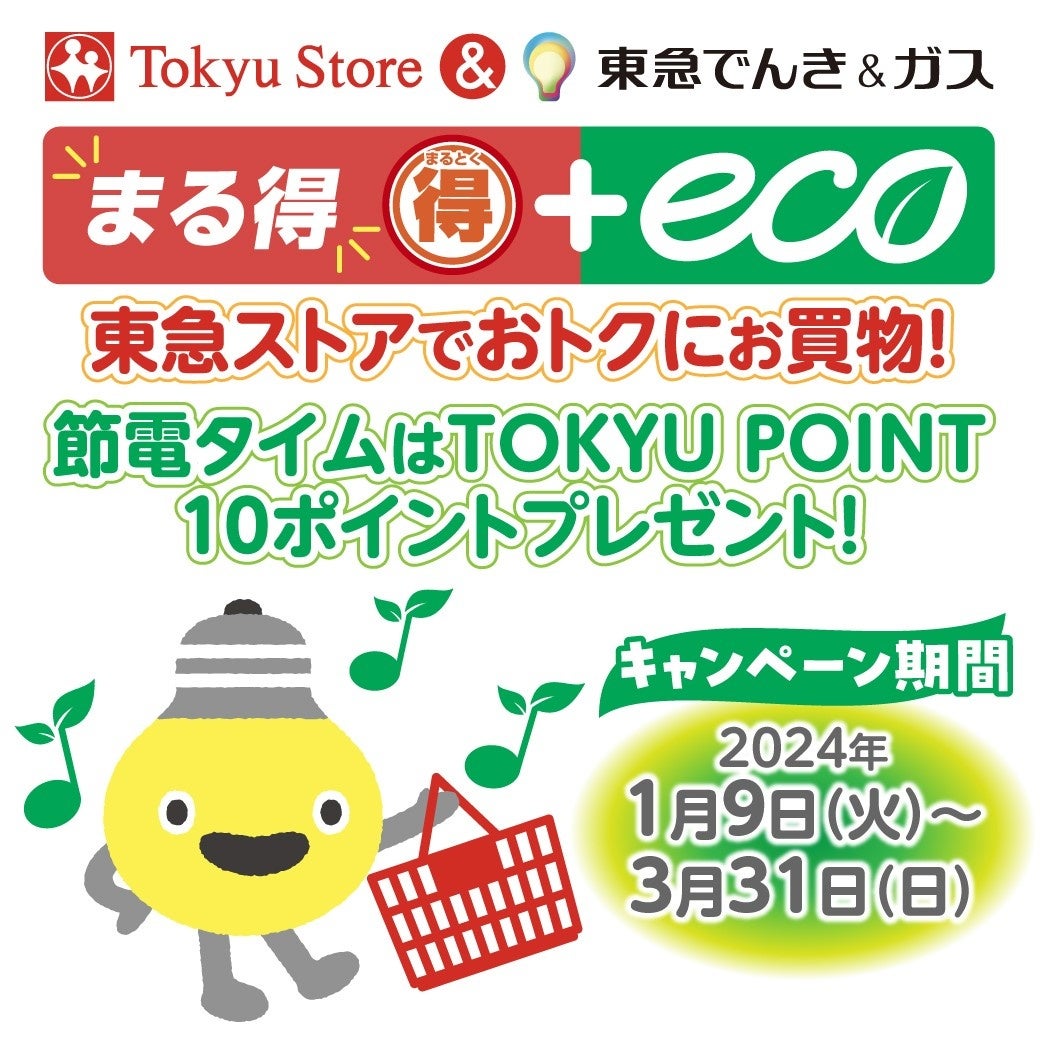 本キャンペーンは、両社が2019年9月から提供している「まる得ポイント+[プラス]」(毎日のお買物でポイントを重ねどりできるおトクなポイントサービス)と、東急パワーサプライが2023年12月1日から実施している「冬の節電プログラム2023」を連携して実施するものです。節電タイムに外出して、東急ストアにて2,000円以上のお買物をしていただいた方に、TOKYU POINT10ポイントをプレゼントいたします。