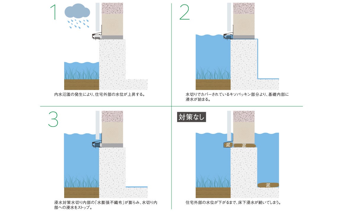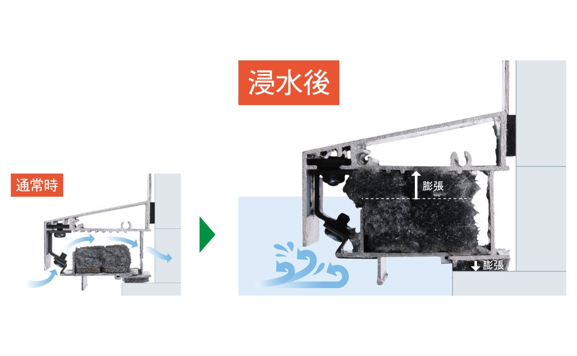 内水氾濫などの水害発生時、水切り本体に内蔵された「水膨張不織布」が膨らむことで床下への浸水を防ぎ、復旧の負担を大幅に軽減します。