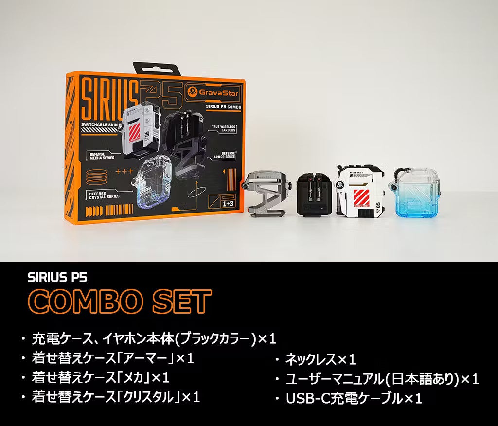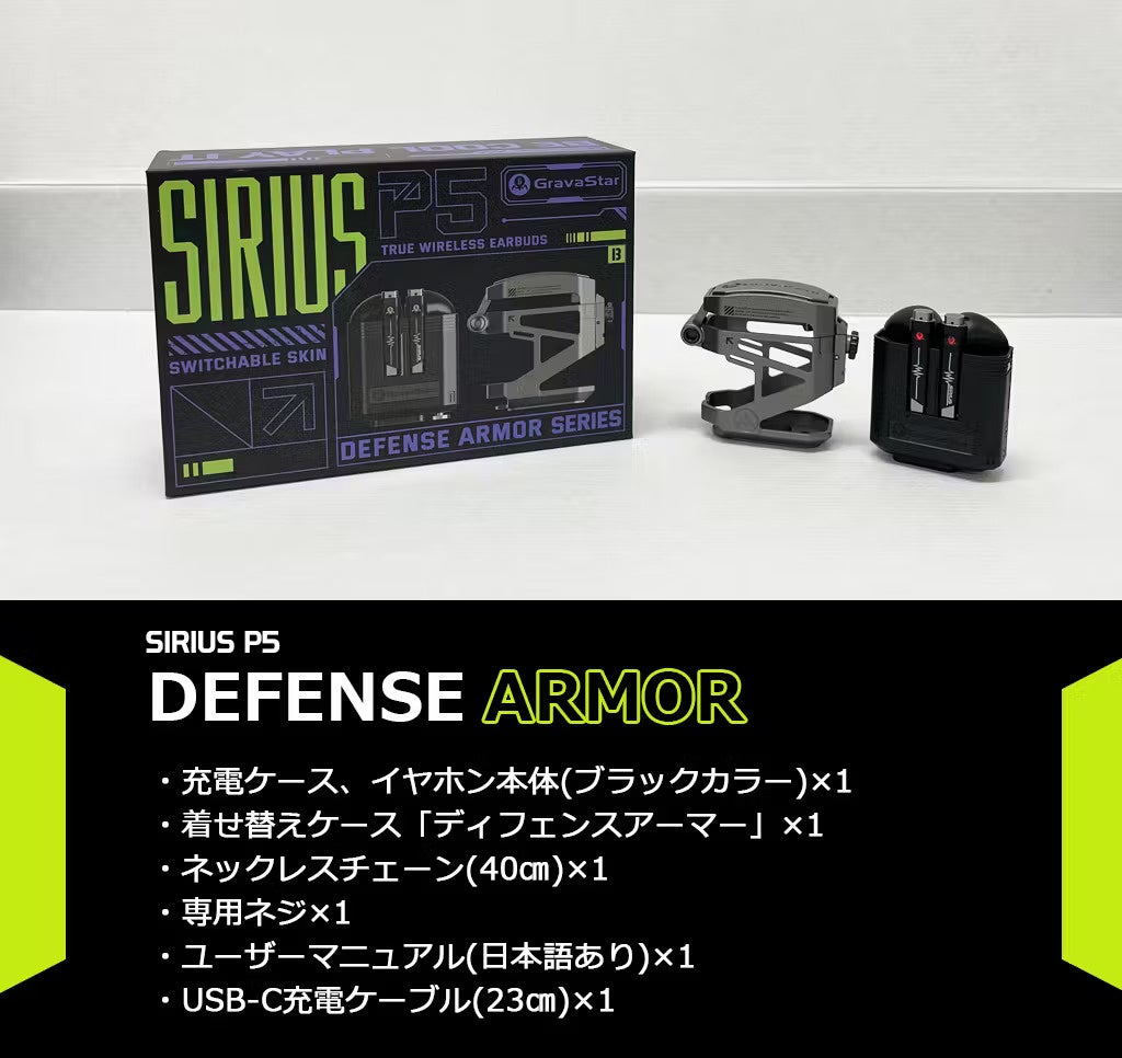 「ディフェンスクリスタル」、「ディフェンスメカ」、「ディフェンスアーマー」の着せ替え3種がセットになったコンボセットもご用意しております!こちらの充電ケース+イヤホン本体はブラックカラーが同梱されます。