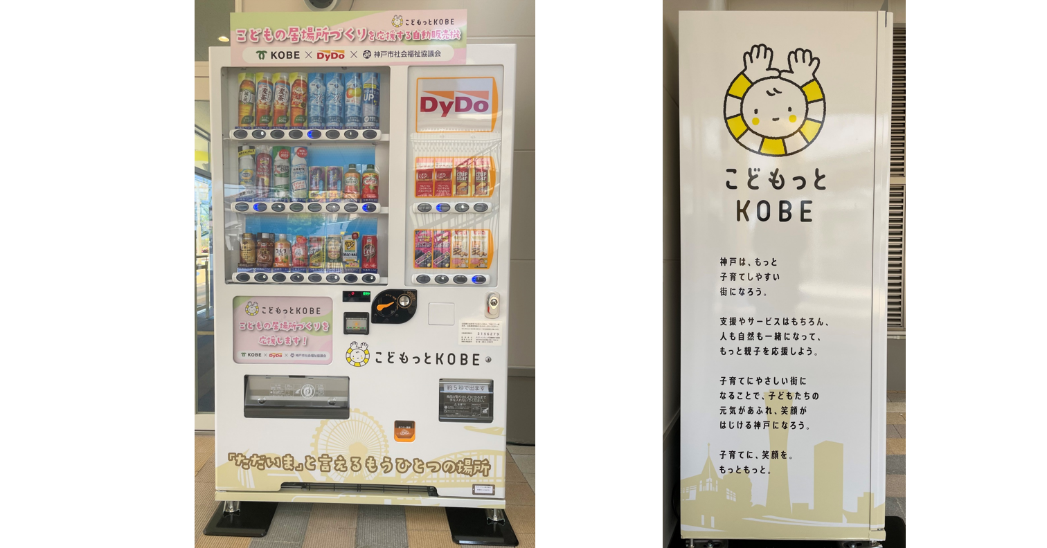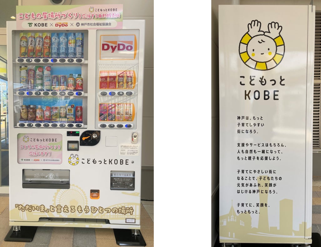 この協定は、経済状況や社会情勢の変化に伴いこどもたちの孤独や孤立を防ぎたいと、「こどもの居場所づくり」の支援を協働で取り組むことを目的に締結され、その取り組みの一環として「こどもの居場所応援自動販売機」(以下、本自販機)を大型児童センターのこべっこランド(所在地:神戸市兵庫区)に同日、設置いたしました。本自販機は、売上金の一部を神戸市社会福祉協議会に寄付し、こどもの居場所づくり事業推進のための活動費に役立てられます。