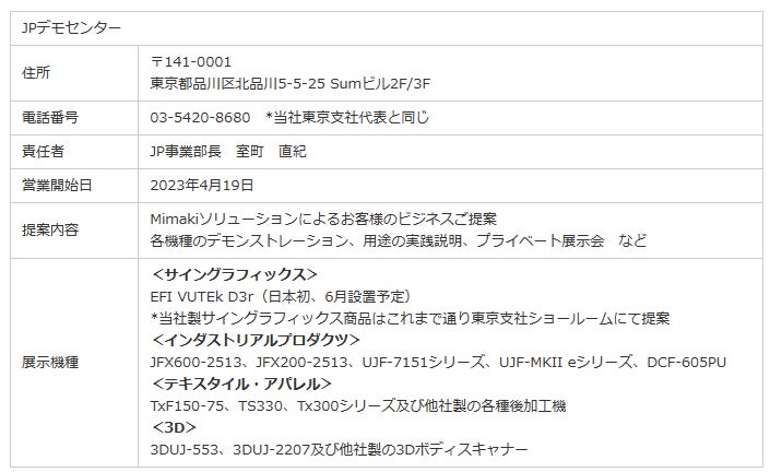 産業⽤インクジェットプリンタ、カッティングプロッタ、3Dプリンタを手掛ける株式会社ミマキエンジニアリング(本社/長野県東御市、代表取締役社長/池田 和明)は、JPデモセンター(旧・東京都品川区西五反田)を品川区北品川に移転し、4月19日に営業を開始します。