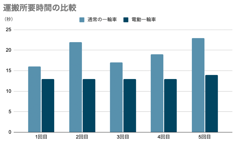 電動一輪車を使用した場合、運搬労力の負担が軽減され毎回ほぼ一定の時間で運ぶことができました。