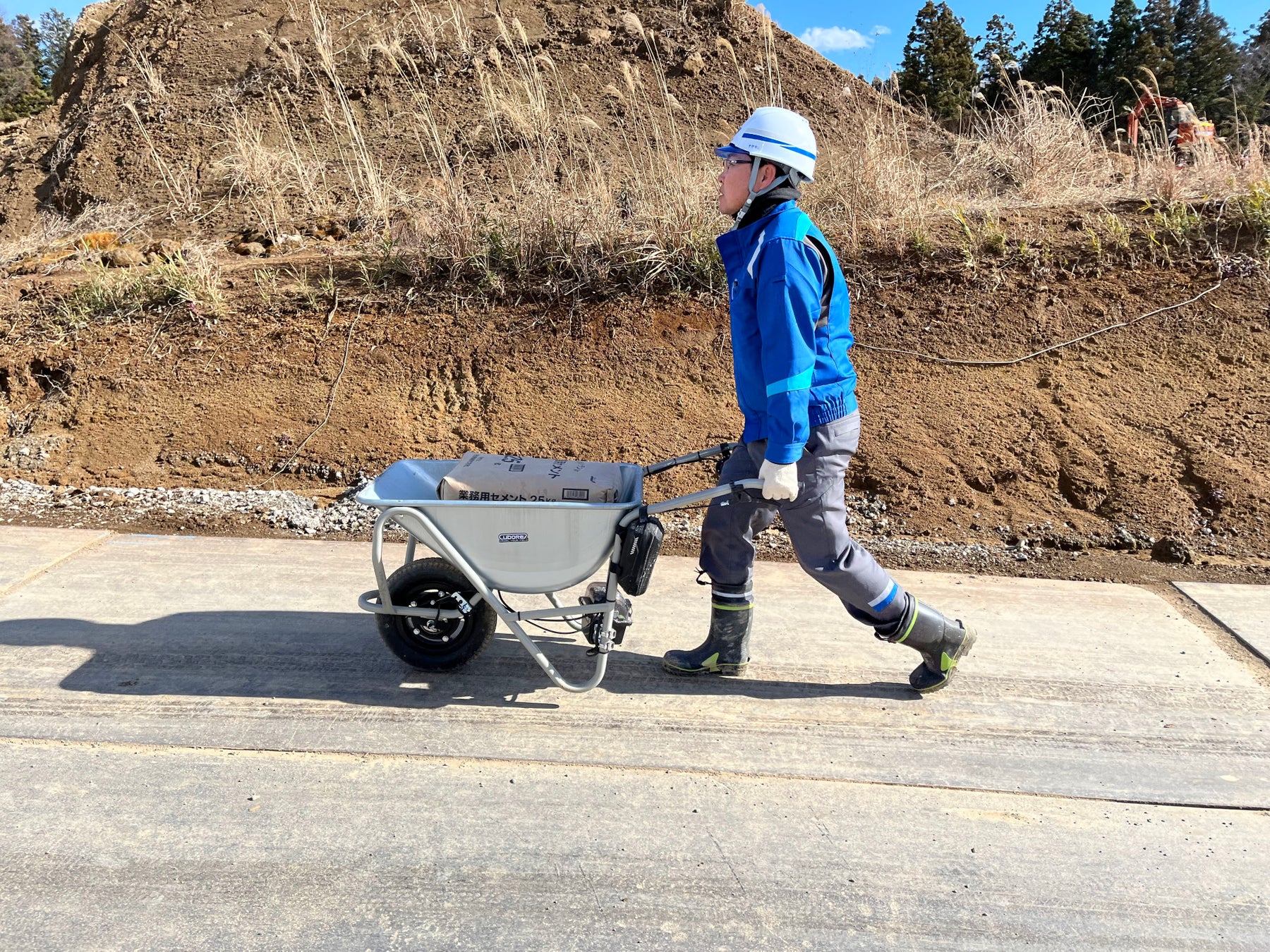 作業後のアンケート調査では、電動一輪車を使用した100%が「通常の一輪車に比べて疲労度が少ない」「作業効率の向上を感じた」「今後も使い続けたい」と回答。担当者からは75kgの重量を載せていても一輪車のバランスを取ることが容易であり、勾配のある道もスムーズに走行可能であったとの所感がありました。