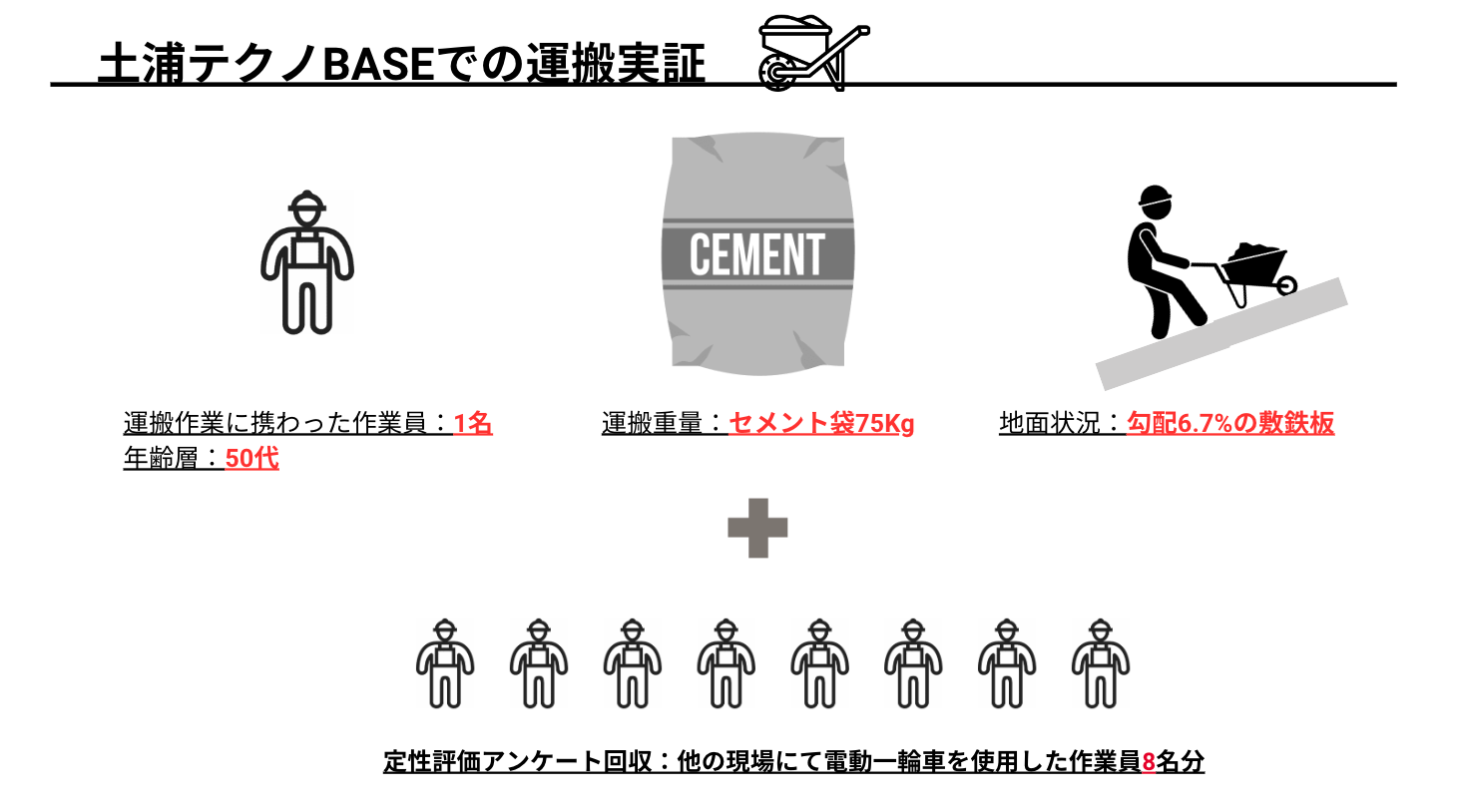 検証方法:セメント袋を載せた状態で30mの距離を運搬。電動一輪車と一般的な一輪車とを利用した際の登板に要する時間を比較