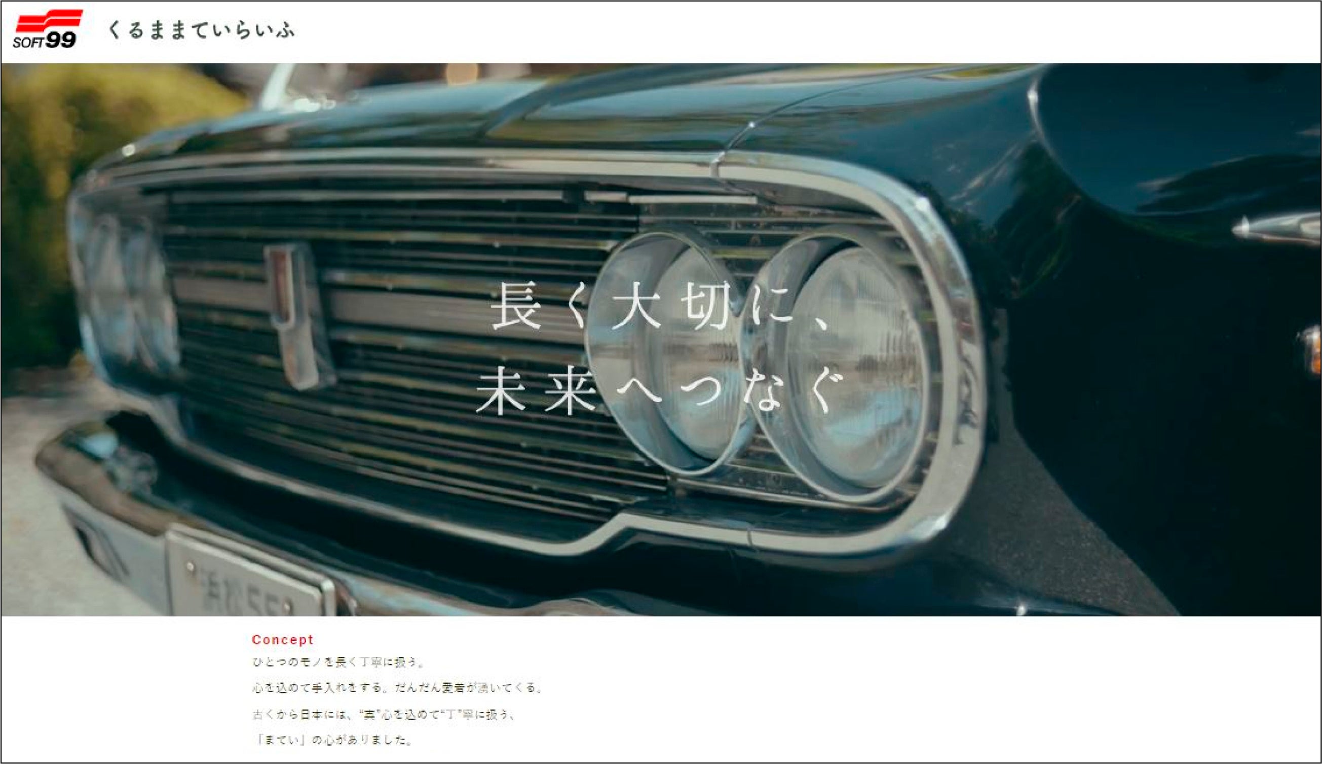 ひとつのモノを長く丁寧に扱う。心を込めて手入れをする。だんだん愛着が湧いてくる・・・ソフト99は、単に新しい車に乗り換えるのではなく「丁寧に扱い、長く大切に乗り続ける」事に大いなる意味を感じています。このようなカーライフスタイルを“くるままていらいふ”と称し、車を長く大切にするカーオーナーの皆様と一緒に取り組んでまいりたいと考えております。