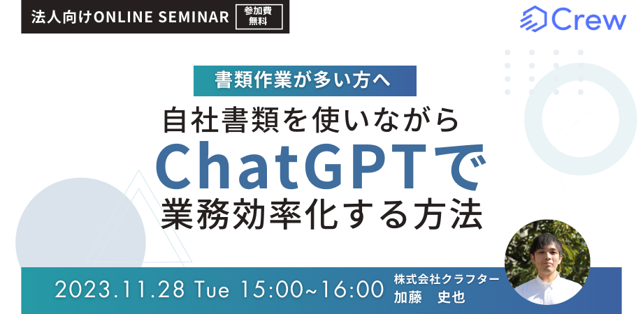 2023年11月28日(火)15時から法人向け『書類作業が多い方必見!自社書類を使いながらChatGPTで業務効率化する方法』をテーマに無料ウェビナーを開催いたします。