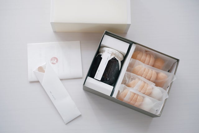 紅白のパッケージを桐箱に詰めて
