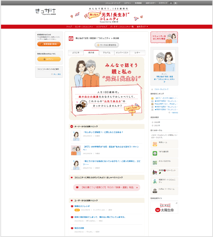 産経新聞社(東京都千代田区/代表取締役社長:近藤哲司)とクオン(東京都港区/代表取締役:武田隆)が共同で運営し、太陽生命保険株式会社(東京都中央区/代表取締役社長:副島直樹)が協賛する「みんなで話そう、100歳時代 親と私の“元気!長生き!”コミュニティ」は2021年11月の開設からまもなく1年を迎えます。本リリースでは、本コミュニティに関する最新のレポートを公開します。【URL】 https://www.beach.jp/community/TAIYO-SEIMEI
