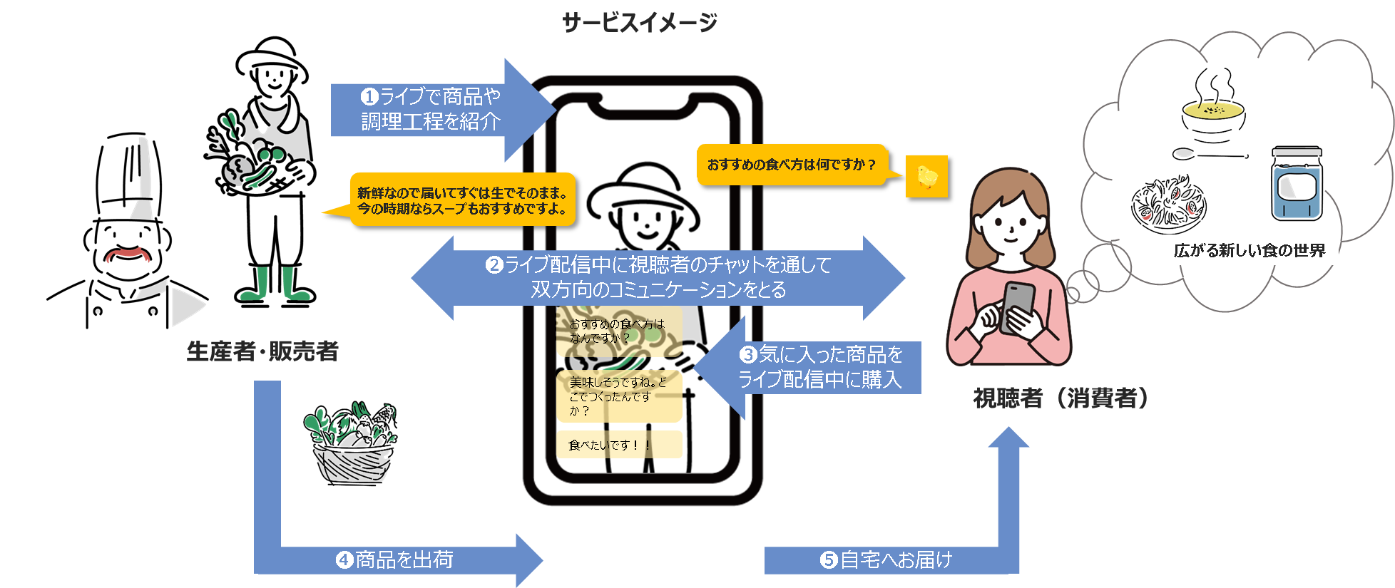 私たちの生活に欠かせない「食」には、生産者・販売者のおいしさへのこだわり、工夫、生産者・販売者だから知っているおいしさを引き出すための調理方法など、知るだけでもっと楽しくなる「おいしさの理由(ストーリー)」が隠れています。消費者は「生産者・販売者の顔を見て、会話を通じて、そのストーリーを知りたい」、そして生産者・販売者には「そのおいしさの理由(ストーリー)を直接届けたい」、そんな双方の想いを実現する「食」のライブコマースの提供を開始します。日本全国の生産者・販売者と消費者をつなぎ、日々の「食」に、もっと楽しみ、もっとワクワクを提供します。