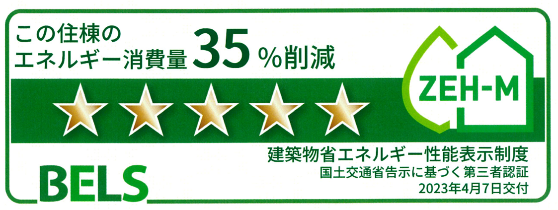本物件では、建物の断熱性能を大幅に向上し、高効率な設備等を導入することにより、マンション全体での年間の一次エネルギー消費量を現行の省エネ基準値より35%削減(再生エネルギーを除く)し、「建築物省エネルギー性能表示制度:BELS(ベルス)」において最高ランクの5つ星評価を受け、ZEH-M Oriented認証を取得しました。
