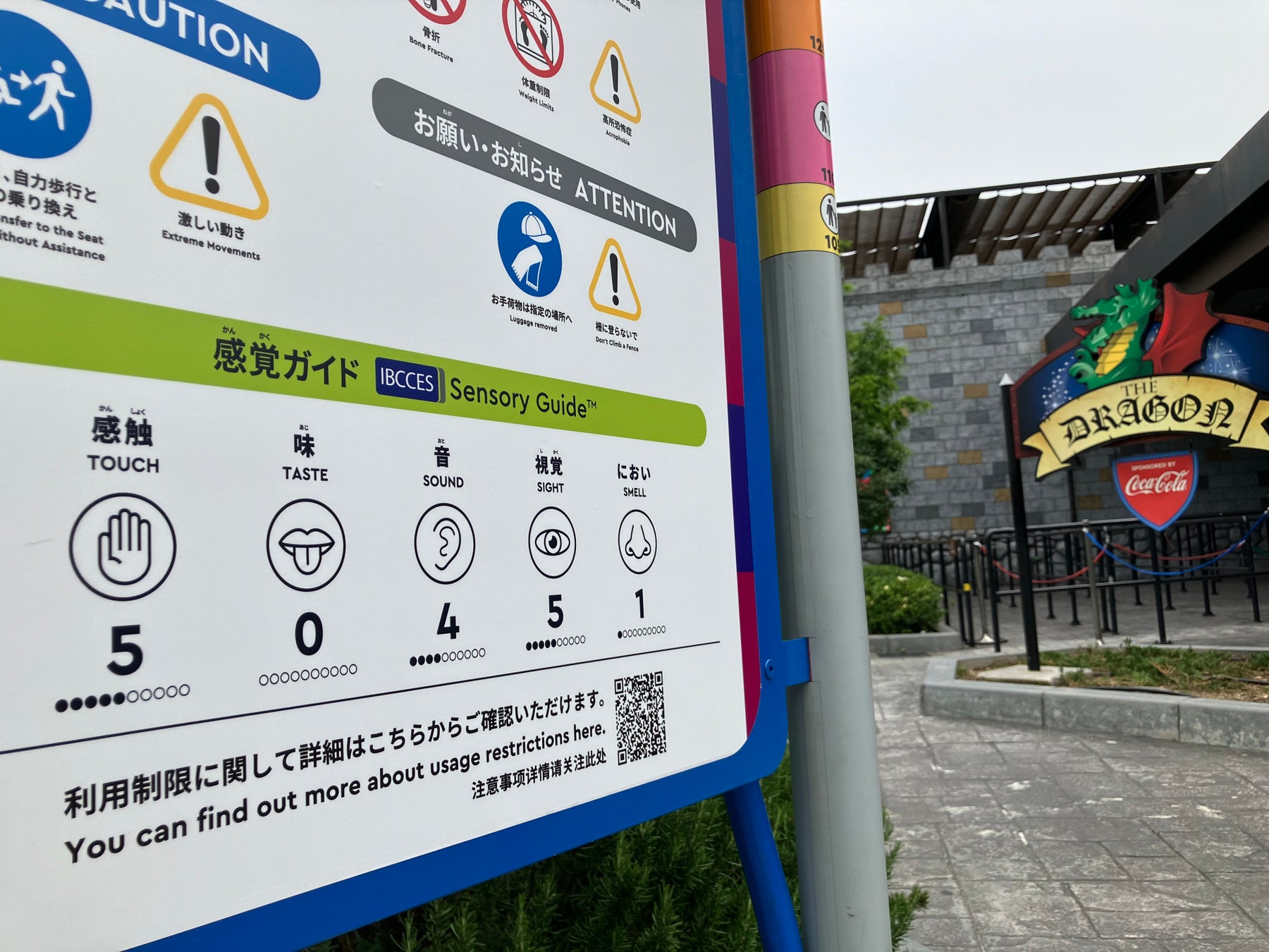 パーク内全てのアトラクションにIBCCESが開発した感覚ガイド(触覚、味覚、聴覚、臭覚、視覚のそれぞれの刺激の強さについての11段階)を設置。照明の明るさや環境音の大きさなどの指標を示すことで、ゲストやその家族はニーズに沿った行動計画を立てやすくなります。