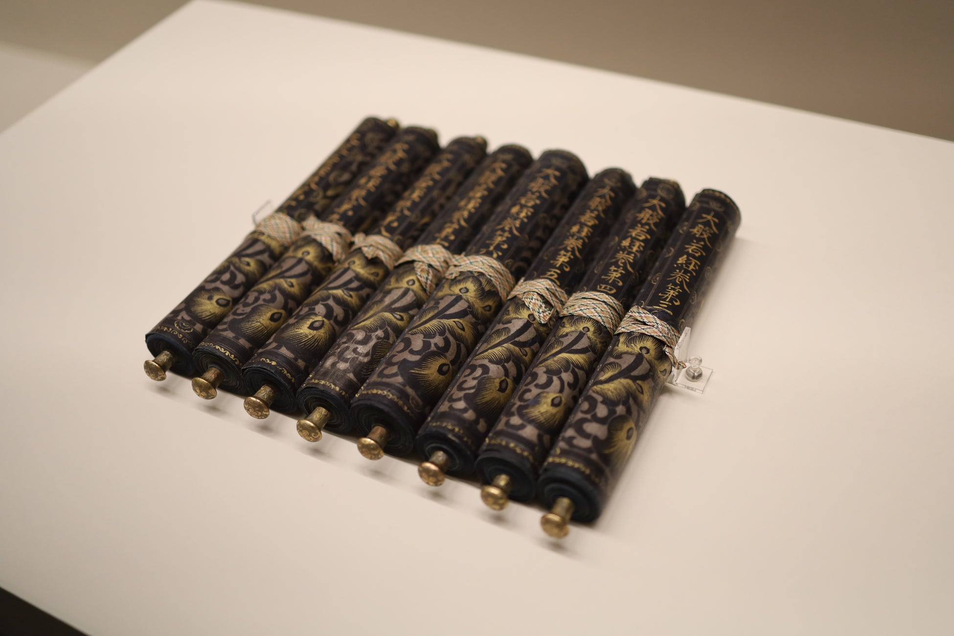 掛け紙のデザインには、今回の展覧会のメインカラーであるグリーンを背景に、業用虚空蔵菩薩と神護寺経の宝相華唐草文を採用。