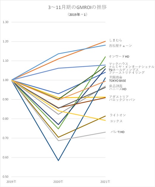 - 少ない在庫で多くの粗利益を稼ぐ力の指標であるGMROIは15社が前年より改善した。コロナ禍前の2019年を超えた会社も8社あった