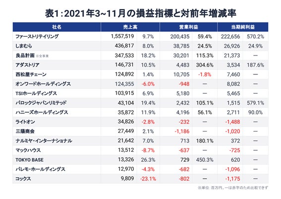 主要アパレルの2021年3~11月決算は「仕入れ抑制&在庫削減で利益向上」が鮮明に