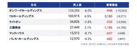 営業損益をみると、前年が黒字だった10社のうち、西松屋チェーンとコックスを除く8社が増益を果たした。しかし西松屋チェーンは1.8%の減益で、コックスは24百万円の黒字から802百万円の赤字に転落した(表1から下表に抜粋)。
