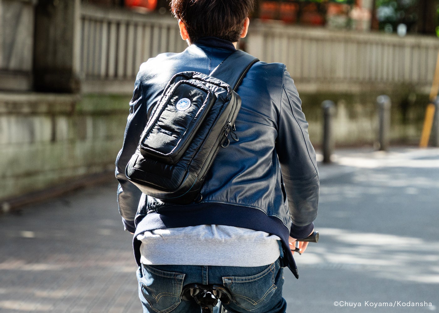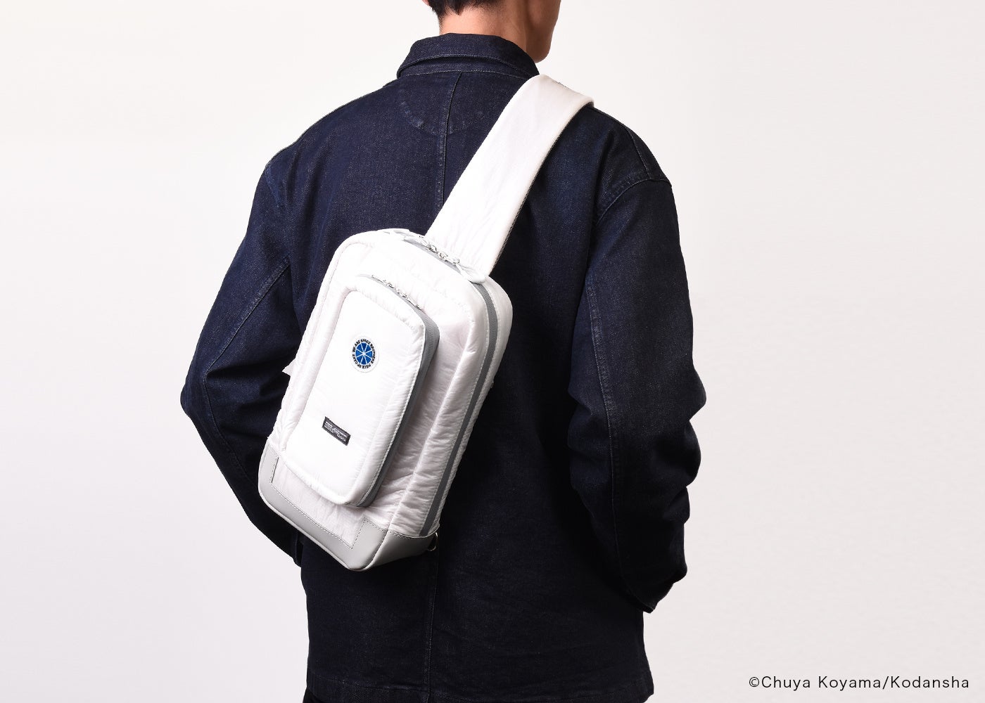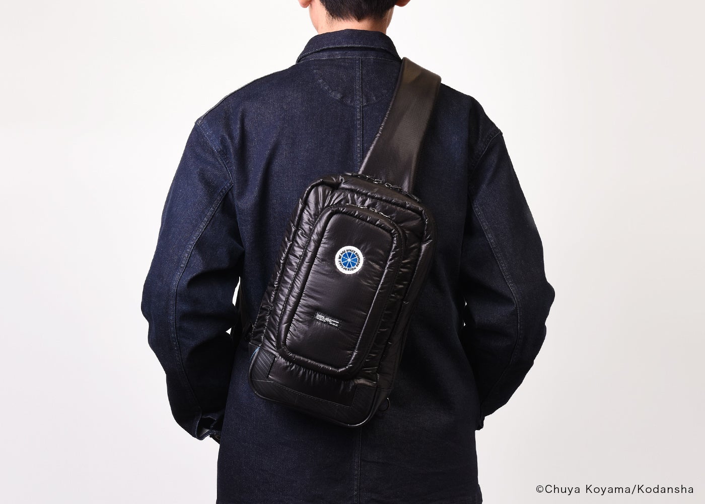 藤倉航装のパラシュート素材と、廃棄されたタイヤチューブ(ブラックカラーのみ)を使用したワンショルダーバッグが誕生しました。本製品は、人気漫画『宇宙兄弟』で南波六太が着用する月面宇宙服をモチーフにデザインされ、洗練されたディテールと高い機能性を兼ね備えています。