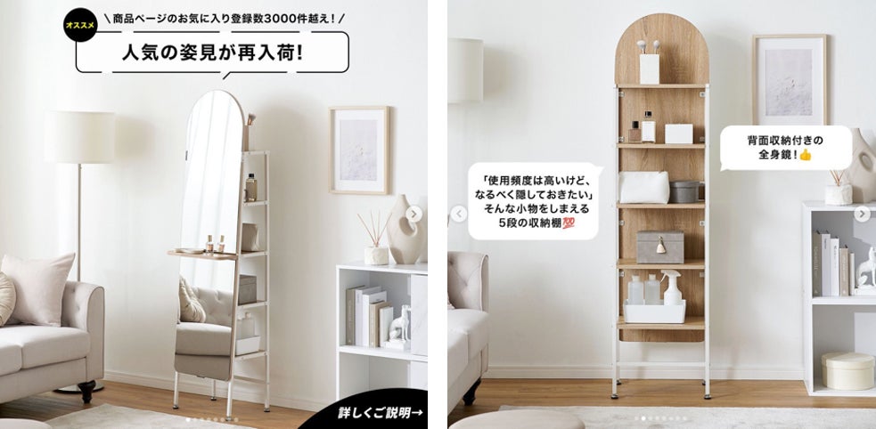 公式SNSで投稿後、わずか2週間で875万回再生され、初回の在庫が完売した“推し活”のための収納棚「オシテル」や、投稿後から再生回数などが伸びに伸び、販売から1年以上がたっても再販がかかる“デッドスペース”を活用した姿見など5〜10種類が常に展示されるだけでなく、アイテムの活用方法やその機能性が伝わるよう、日々社内制作しているSNSの投稿動画を大画面で放映いたします。
