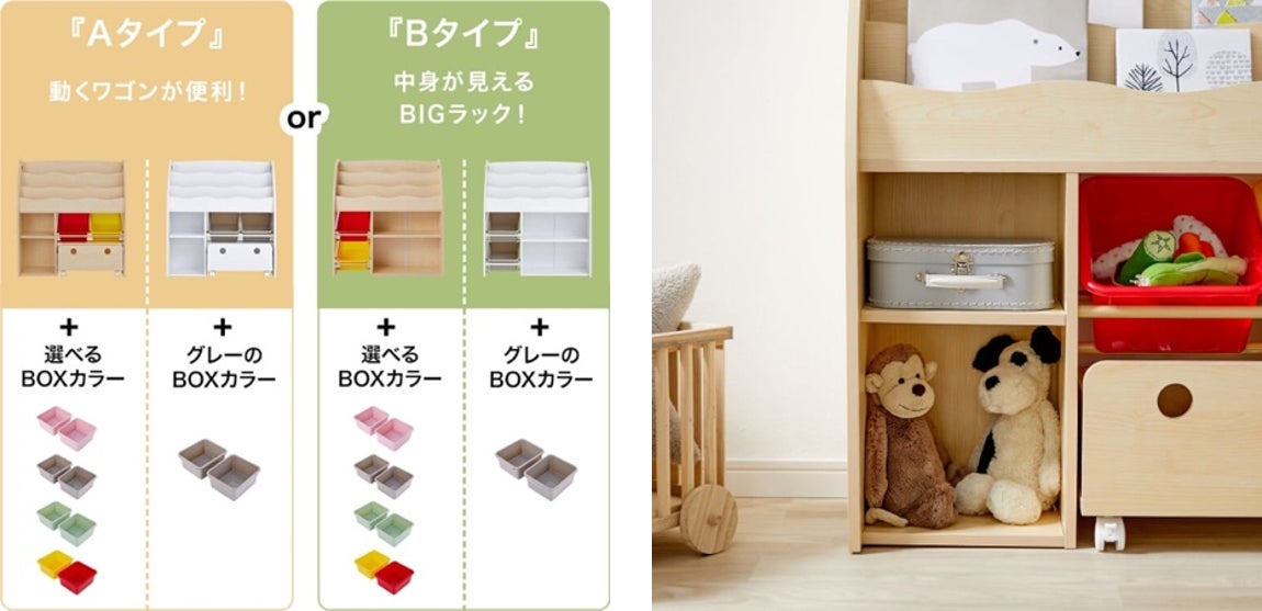 お店屋さんごっこを楽しめるおもちゃキッチン収納、自分だけのおうち図書館ができあがる絵本棚、散らかりやすいお部屋もスッキリ収納できるラックなど、子どもたちが毎日をワクワクしながら暮らせるように考えられた商品が並びます。