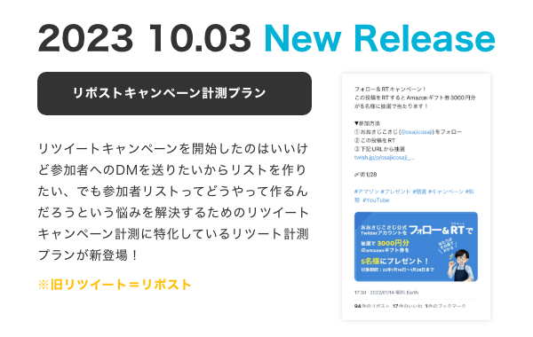 リツイートキャンペーンを開始したのはいいけど参加者へのDMを送りたいからリストを作りたい、でも参加者リストってどうやって作るんだろうという悩みを解決するためのリツイートキャンペーン計測に特化しているリツート計測プランが新登場!