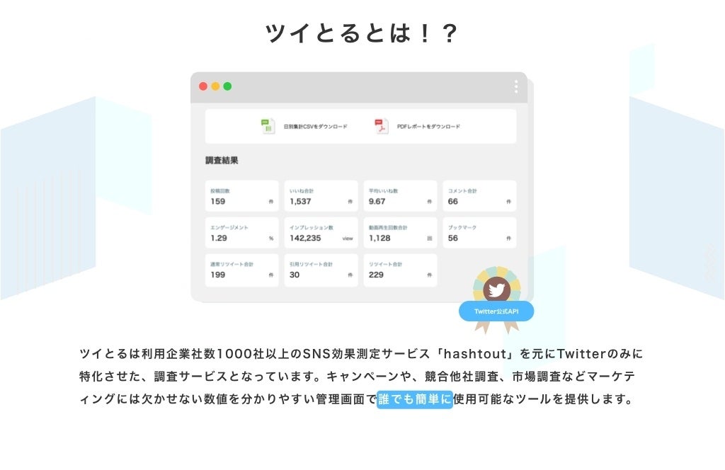 ツイとるは利用企業社数1000社以上のSNS効果測定サービス「hashtout」を元にTwitter(現:X)のみに特化させた、調査サービスとなっています。キャンペーンや、競合他社調査、市場調査などマーケティングには欠かせない数値を分かりやすい管理画面で【誰でも簡単に】使用可能なツールを提供します。